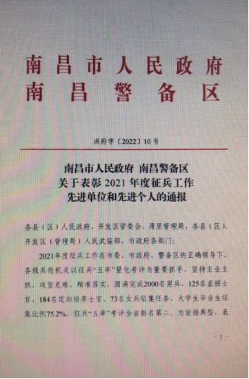 近日,南昌市人民政府、南昌警备区印发了洪府字[2022]10号《关于表彰2021年度征兵工作先进单位和先进个人的通报》的文件通知。我校因征兵工作成绩突出、任务完成较好,受到通报表彰,并荣获“2021年度征兵工作先进单位”荣誉称号。
