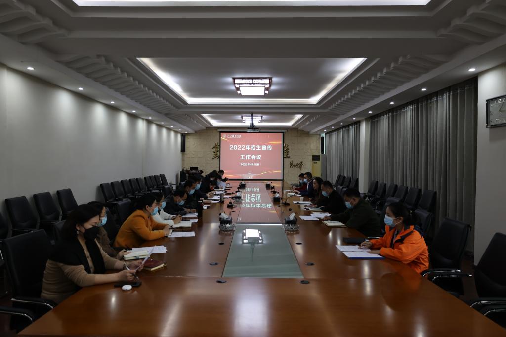 4月16下午,我校在行政楼二楼会议室召开2022年招生宣传工作会议,研究部署疫情防控期间招生宣传工作,校长薛家宝、副校长李宝君出席会议并讲话,各学院院长、书记及相关部门负责人参加会议,会议由招生办主任王敏主持。