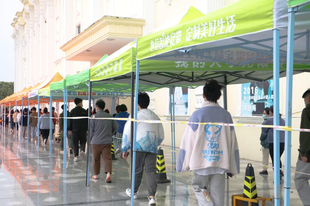 启动校园封闭封控管理后,非密接者和次密接者都要进行核酸检测。志愿者指引师生保持两米距离,有序进行全员核酸检测。