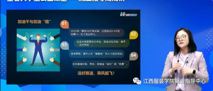 (就业办陈康康供稿)为找到疫情防控常态化形势下大学生求职的破局之道,培育正确的当代大学生职业生涯规划,2022年4月29日晚,由江西省教育厅主办,面向全省大学生的线上公益课堂——就业指导周周讲在线上准时开课。江西服装学院积极响应江西省教育厅号召,我校就业办李玲副主任组织部分在校学生在主教楼一110进行观看,各分院以线上形式进行共同学习,本次全省大学生公益课我校师生参与观看人数达5200人。