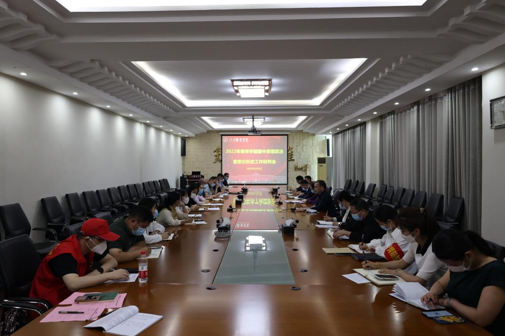 【新闻中心讯 文/龙瑞行 图/万强】5月5日,我校在行政楼二楼会议室召开2022年春季学期期中思想政治工作暨意识形态工作研判会。校党委书记陈付龙出席会议并讲话,党委副书记唐新强主持会议,各学院、各相关部门负责人参加会议。