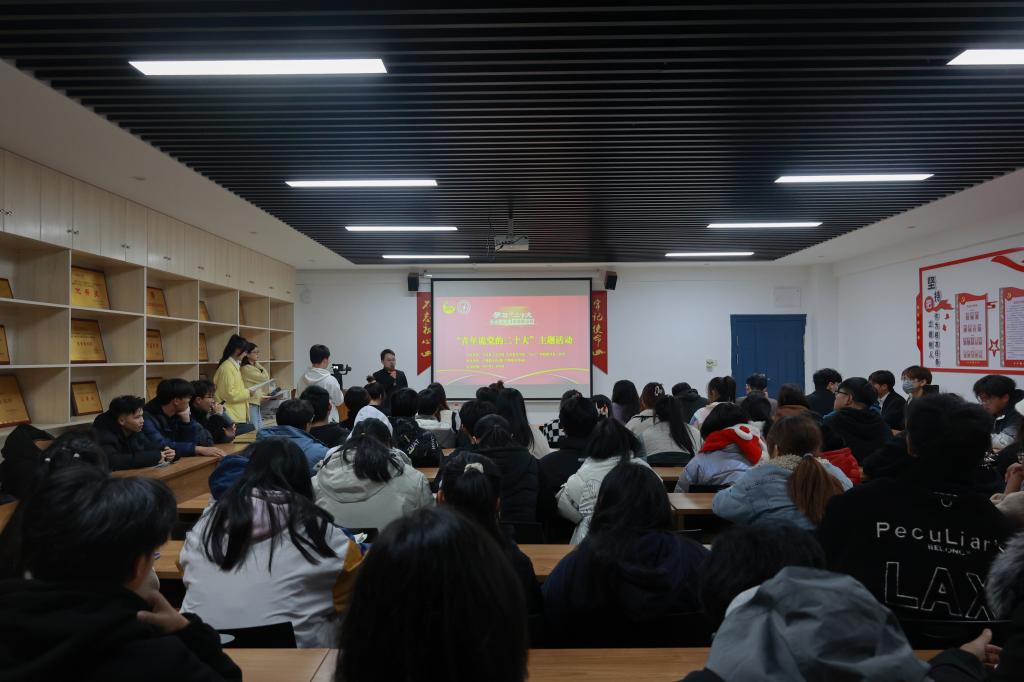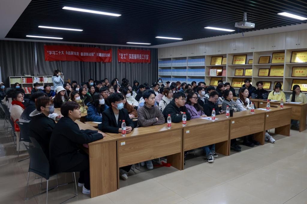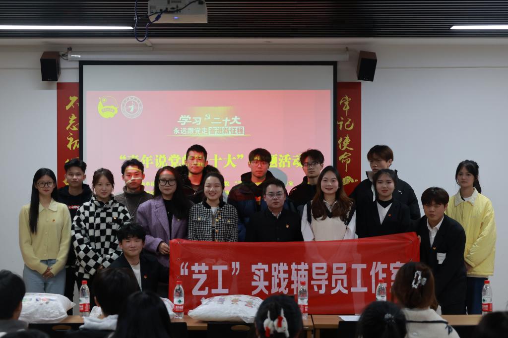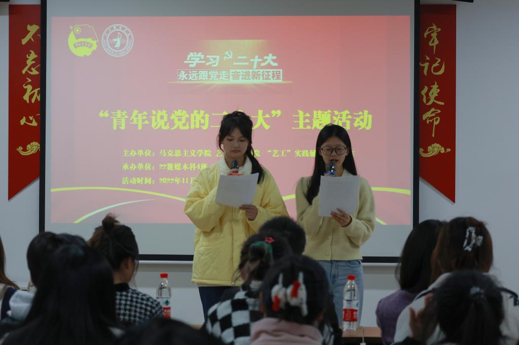 新闻中心讯(记者/金温南 李常凤 宫之昊 李鹏飞(实习记者) 摄影/黄珊 汪小梅)为推动学习宣传贯彻党的二十大精神走深走实,进一步创新理论宣讲,用青言青语宣讲党的二十大精神,发挥团员青年力量,让学生宣讲员走到青年中去,讲到青年心里。11月30日晚,由马克思主义学院、艺术设计学院、“艺工”实践辅导员工作室联合举办的“青年说党的二十大”主题活动在艺术楼429教室举行。青年师生宣讲团陈洋安老师、刘清霞、薛欣瑜、曹雅萱、姜灿灿以及22数媒本科4班和22数媒本科8班全体学生参加活动。活动由艺术设计学院22数媒本科4班学生潘晓宇、吴凌梦主持。