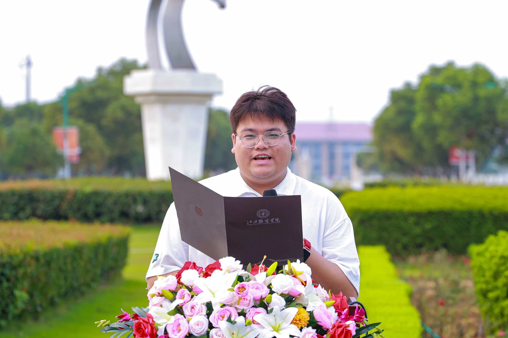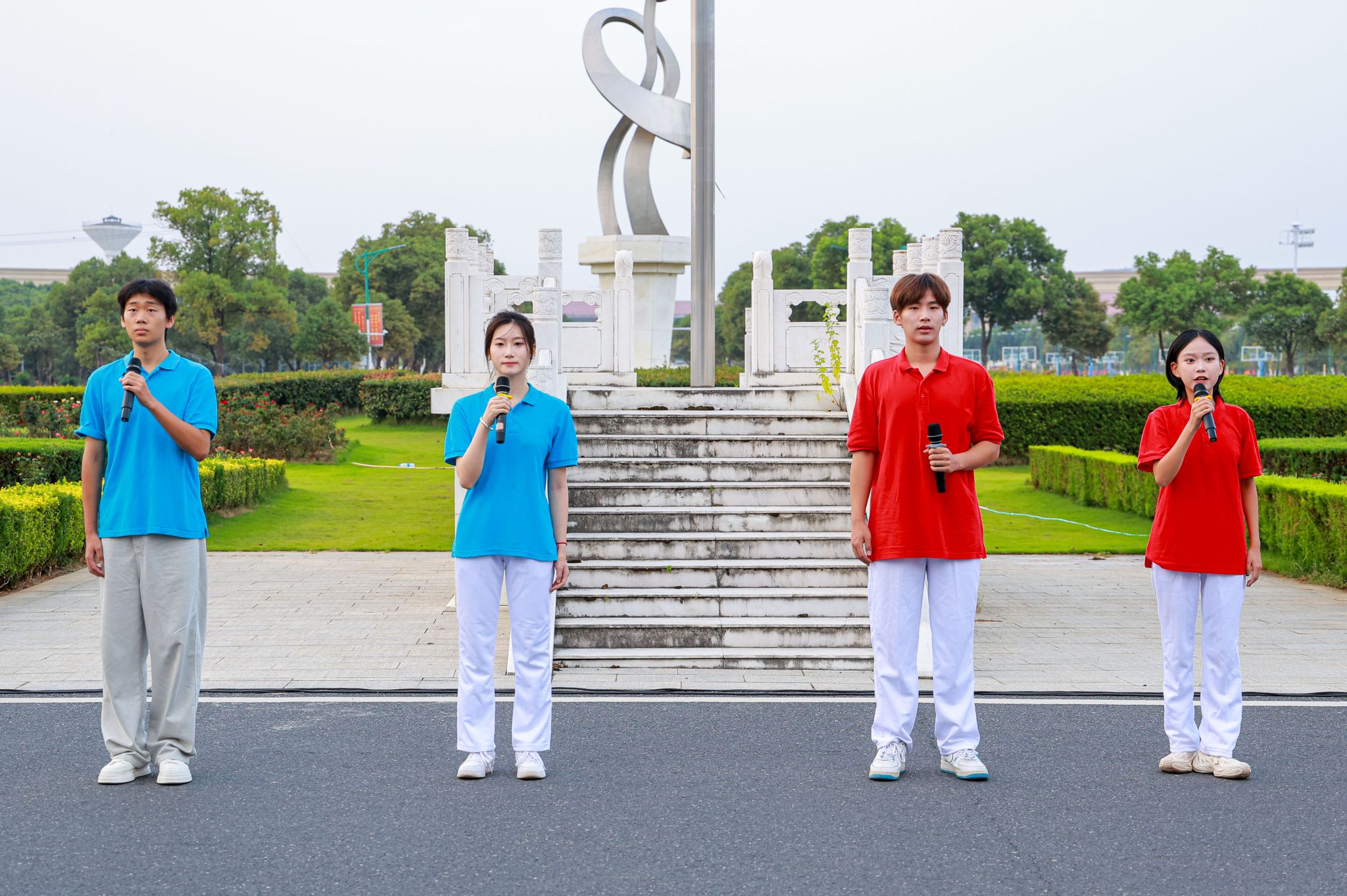 “我骄傲,我是江服人!”在青春榜样事迹分享环节,四位不同领域的优秀学子代表依次分享成长故事。2024级商务英语本科2班唐德瑞(社会实践三下乡代表)讲述其暑期扎根江西乡村,参与田间劳作、关爱乡村儿童、为文旅发展提出新建议的实干经历;2023级视觉传达设计本科1班施宇翔(科创赛事代表)回顾带领团队获第十九届“挑战杯”江西省赛历史最好成绩,及累计斩获5项国家级、10余项省级奖项的奋斗历程,传递“试错就是积累”的探索精神;2023级动画本科1班胡杨蕊(微团课省赛获奖代表)结合备战经历,提出“爱国藏在每一次认真上课、每一次专业实践中”,表示将用动画画笔传递中华文化、展现祖国发展;2022级产品设计1班刘姝含(纺织之光奖学金获得者)解读“纺织之光”的寓意,指出纺织工业已融入新材料、智能制造等元素,呼吁学子将个人理想融入国家发展与行业进步大局。
