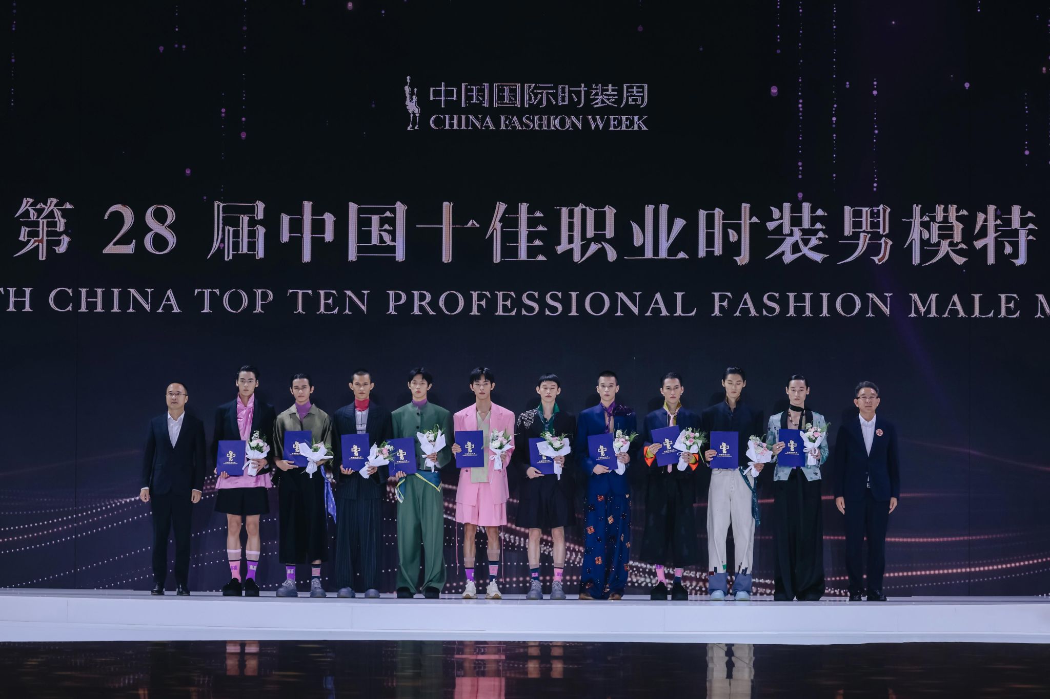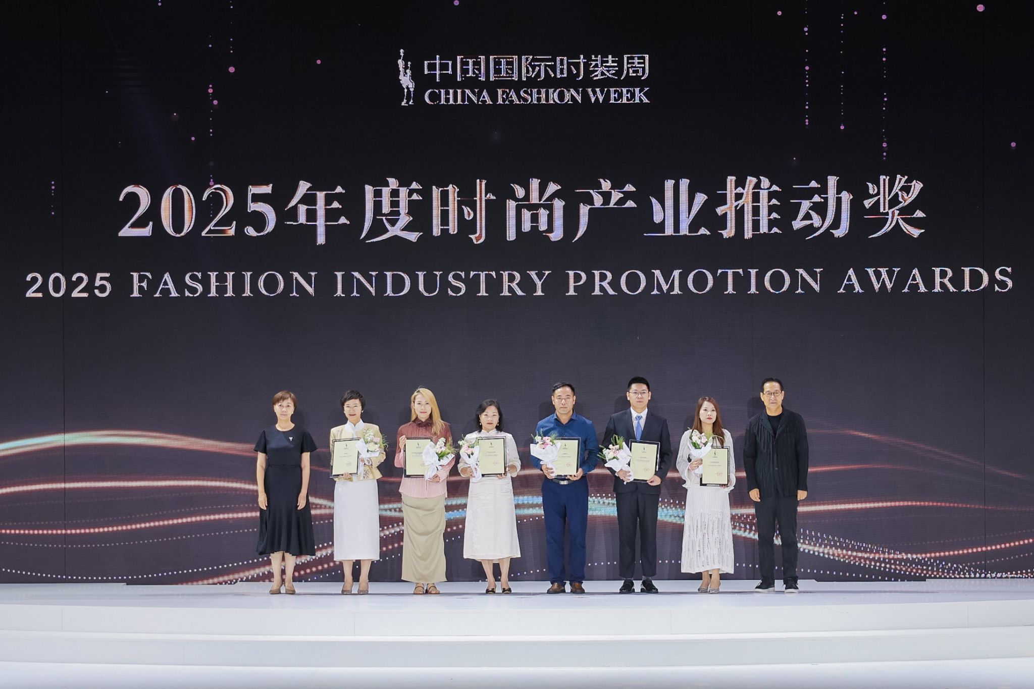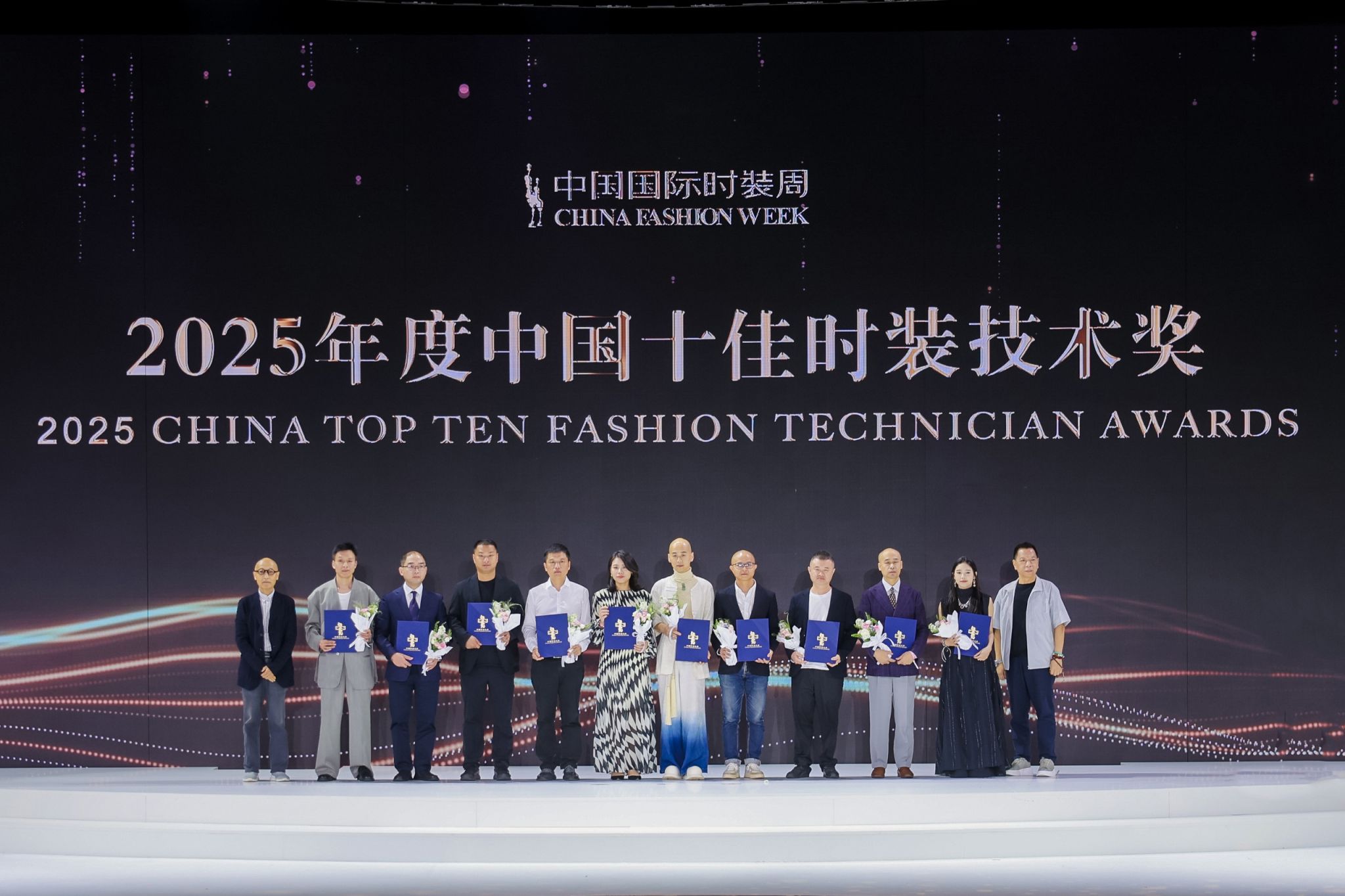 我校教师郭晓强(左三)、成昊(左七)荣获2025年度中国十佳时装技术奖