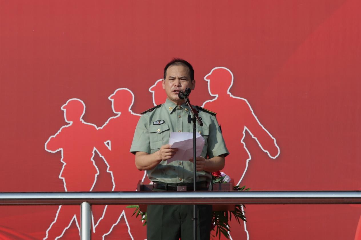 唐新强作动员讲话。他代表学校向承训官兵致以衷心感谢,向全体新生致以亲切问候。他强调,开展大学生军事训练是全民国防教育的重要组成部分,是落实立德树人根本任务和强军目标根本要求的重要途径。在纪念中国人民抗日战争暨世界反法西斯战争胜利80周年、新中国成立76周年的特殊历史节点开展军训,具有深远意义。他向同学们提出三点希望:一是弘扬抗战精神,传承红色基因,以实际行动践行抗战精神,将其转化为克服困难、追求卓越的动力;二是厚植爱国情怀,担当时代重任,将军人作风融入日常,以真才实学服务社会、报效国家,体现新时代青年的使命与担当;三是锤炼意志品质,书写青春篇章,培养严守纪律、团结协作、勇于突破的优良品质,高质量完成训练任务,展现江服学子的优秀风貌。