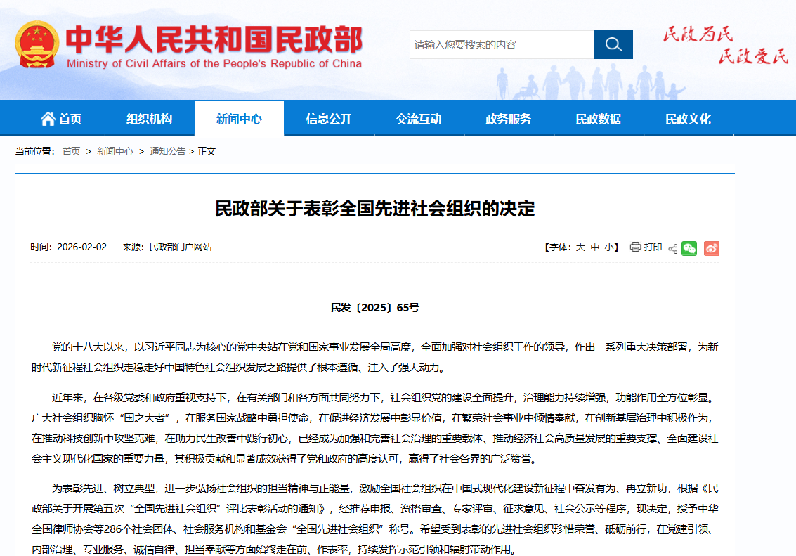 新闻中心讯(文/万强 樊翔)2026年2月2日,民政部正式印发《关于表彰全国先进社会组织的决定》(民发〔2025〕65号),公布第五次“全国先进社会组织”表彰名单。全国共286个社会团体、社会服务机构和基金会获此殊荣。江西服装学院凭借在党建引领、立德树人、社会服务等方面的突出成效,成功入选,成为江西省地方性社会组织中唯一获此国家级表彰的高校,充分彰显了学校在办学水平、治理能力和社会贡献等方面的突出成效,获得国家层面高度认可。
