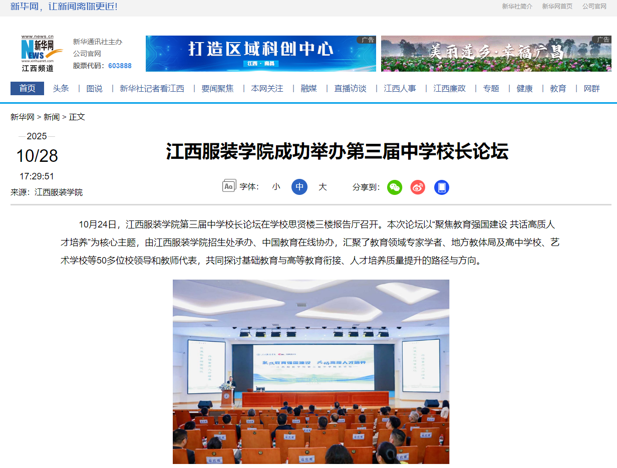 10月24日,江西服装学院第三届中学校长论坛在学校思贤楼三楼报告厅召开。本次论坛以“聚焦教育强国建设 共话高质人才培养”为核心主题,由江西服装学院招生处承办、中国教育在线协办,汇聚了教育领域专家学者、地方教体局及高中学校、艺术学校等50多位校领导和教师代表,共同探讨基础教育与高等教育衔接、人才培养质量提升的路径与方向。
