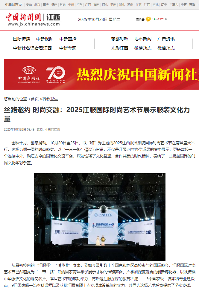 金秋十月,创意涌动。10月20日至25日,以“和”为主题的2025江西服装学院国际时尚艺术节在南昌盛大举行。这场为期一周的时尚盛宴,以“一带一路”倡议为纽带,不仅是江服34年办学成果的集中展示,更搭建起一个连接中外、融汇古今的国际化交流平台,深刻诠释了文化互鉴、合作共赢的时代精神,奏响了一曲跨越国界的时尚文化华彩乐章。