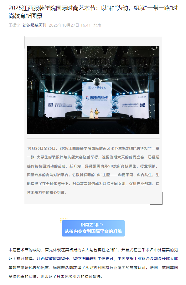 10月20日至25日,2025江西服装学院国际时尚艺术节暨第29届“润华奖”“一带一路”大学生时装设计与技能大会隆重举行。这场为期六天的时尚盛会,已经超越传统校园活动的范畴,跃升为一场凝聚国内外90余所高校师生、行业领袖、国际专家的高端对话平台。它以其鲜明的“和”主题——和而不同、和合共生,生动演绎了在全球化背景下,时尚教育如何成为联结不同文明、促进产业创新、培育未来力量的核心纽带。