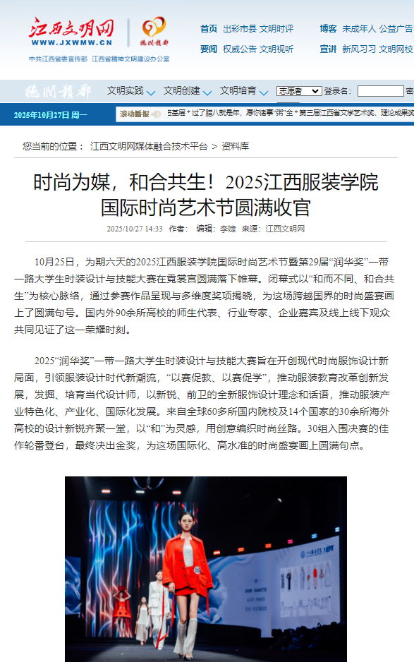 10月25日,为期六天的2025江西服装学院国际时尚艺术节暨第29届“润华奖”一带一路大学生时装设计与技能大赛在霓裳宫圆满落下帷幕。闭幕式以“和而不同、和合共生”为核心脉络,通过参赛作品呈现与多维度奖项揭晓,为这场跨越国界的时尚盛宴画上了圆满句号。国内外90余所高校的师生代表、行业专家、企业嘉宾及线上线下观众共同见证了这一荣耀时刻。