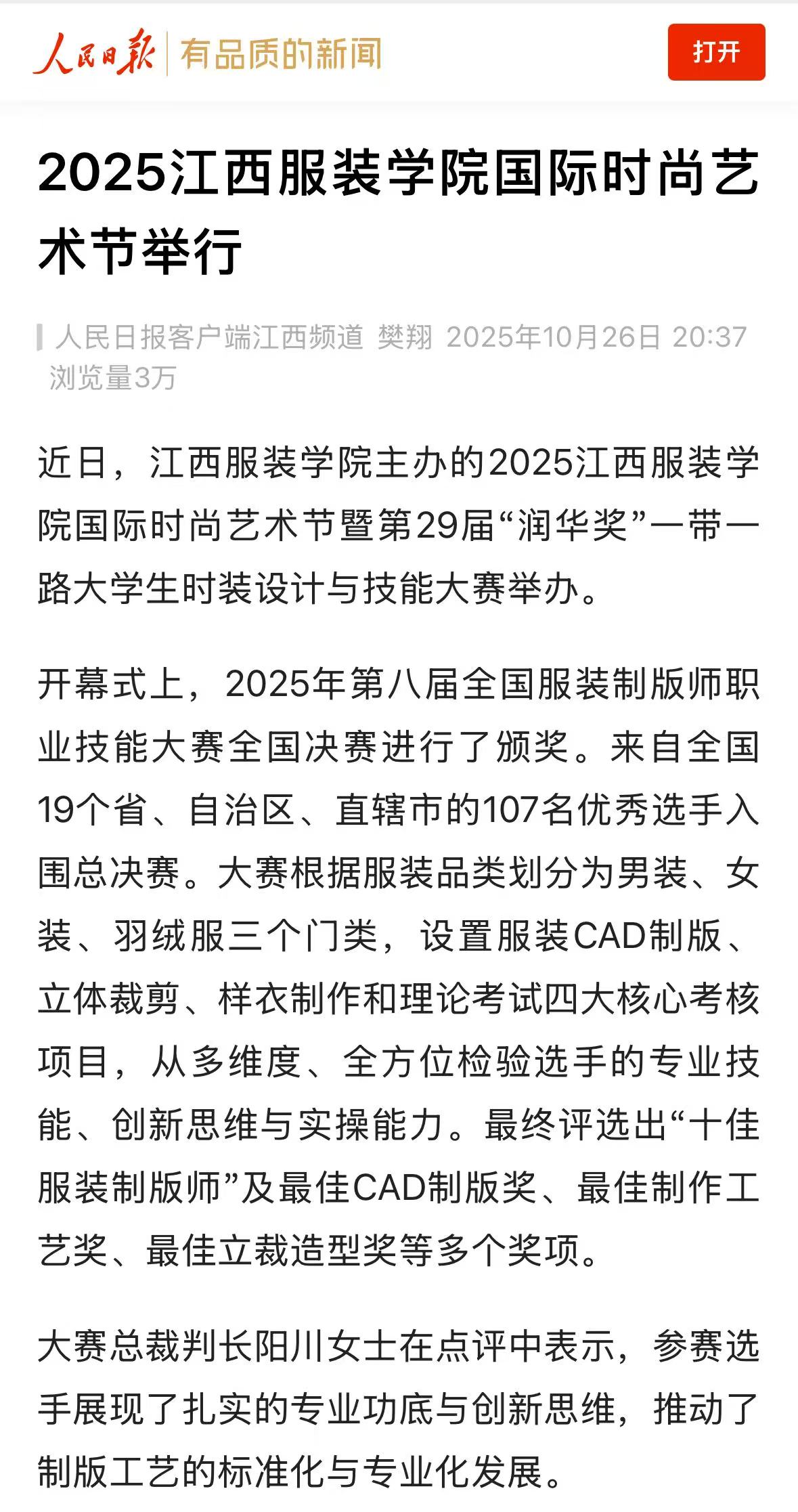 近日,江西服装学院主办的2025江西服装学院国际时尚艺术节暨第29届“润华奖”一带一路大学生时装设计与技能大赛举办。据了解,为期一周的艺术节内容丰富,亮点纷呈,既有激励青年才俊展现创意才华的第29届“润华奖”系列赛事,又有凝聚思想智慧、面向未来的博雅讲坛和国际学术论坛,更有展现审美张力的一带一路时装设计与技能大赛,以及体现三院制人才培养成果的产业学院成果发布、艺术展演和引领潮流的时装发布。