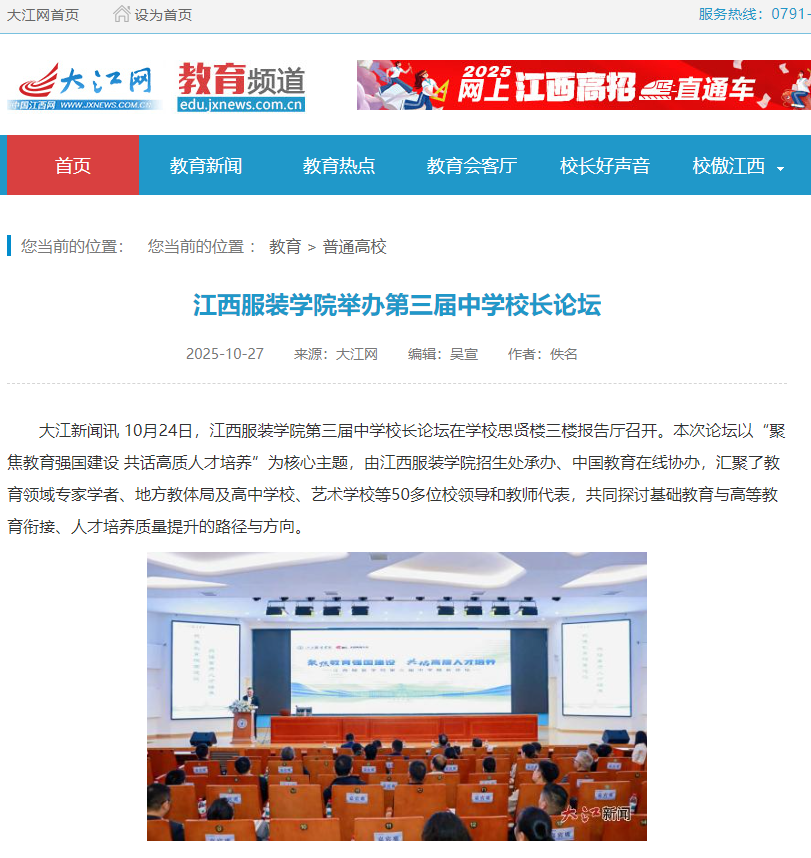 10月24日,江西服装学院第三届中学校长论坛在学校思贤楼三楼报告厅召开。本次论坛以“聚焦教育强国建设 共话高质人才培养”为核心主题,由江西服装学院招生处承办、中国教育在线协办,汇聚了教育领域专家学者、地方教体局及高中学校、艺术学校等50多位校领导和教师代表,共同探讨基础教育与高等教育衔接、人才培养质量提升的路径与方向。
