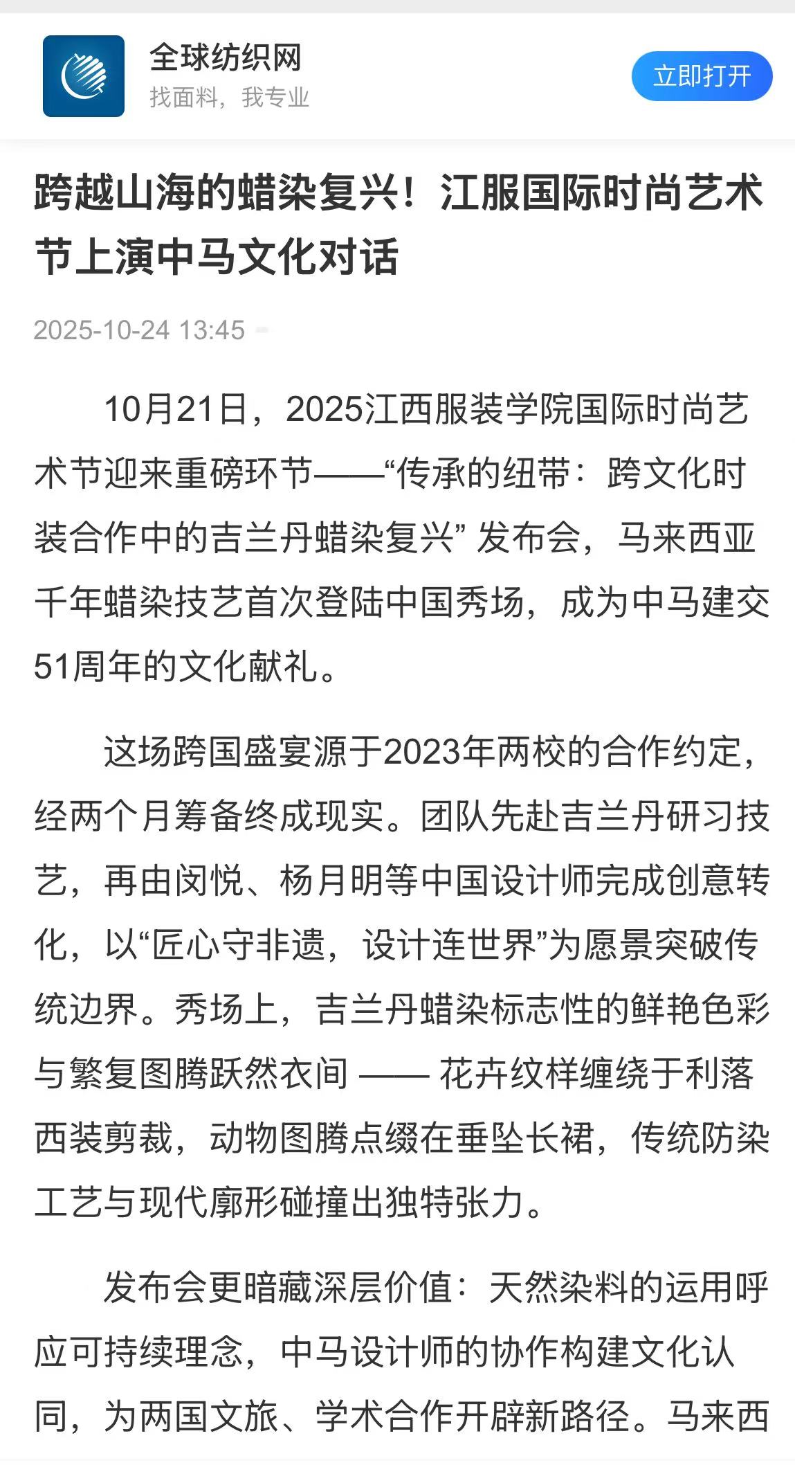 10月21日,2025江西服装学院国际时尚艺术节迎来重磅环节——“传承的纽带:跨文化时装合作中的吉兰丹蜡染复兴” 发布会,马来西亚千年蜡染技艺首次登陆中国秀场,成为中马建交51周年的文化献礼。