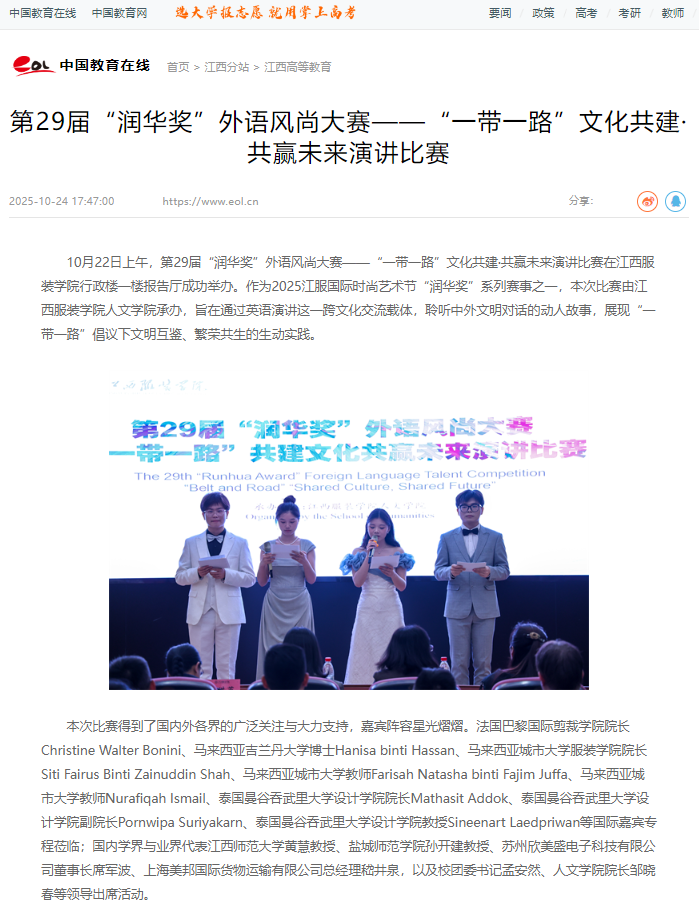 10月22日上午,第29届“润华奖”外语风尚大赛——“一带一路”文化共建·共赢未来演讲比赛在江西服装学院行政楼一楼报告厅成功举办。作为2025江服国际时尚艺术节“润华奖”系列赛事之一,本次比赛由江西服装学院人文学院承办,旨在通过英语演讲这一跨文化交流载体,聆听中外文明对话的动人故事,展现“一带一路”倡议下文明互鉴、繁荣共生的生动实践。
