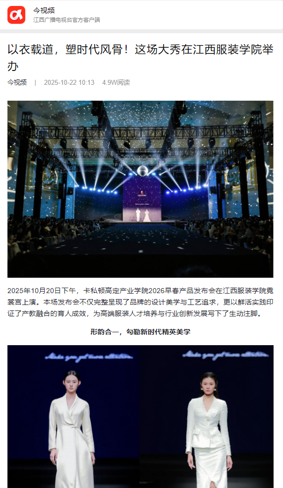 2025年10月20日下午,卡私顿高定产业学院2026早春产品发布会在江西服装学院霓裳宫上演。本场发布会不仅完整呈现了品牌的设计美学与工艺追求,更以鲜活实践印证了产教融合的育人成效,为高端服装人才培养与行业创新发展写下了生动注脚。