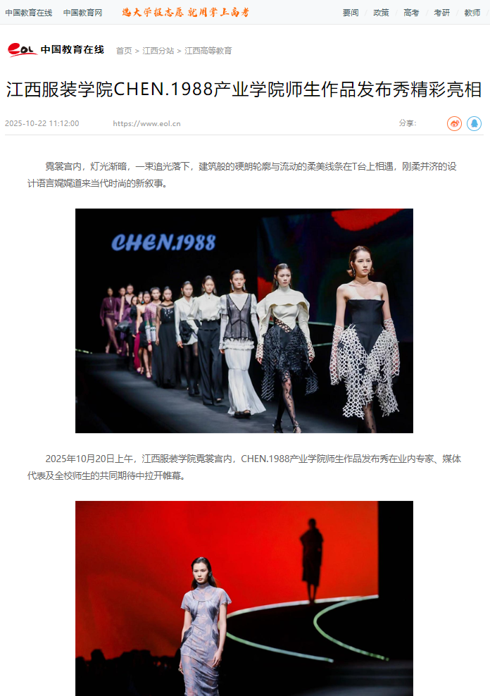 霓裳宫内,灯光渐暗,一束追光落下,建筑般的硬朗轮廓与流动的柔美线条在T台上相遇,刚柔并济的设计语言娓娓道来当代时尚的新叙事。2025年10月20日上午,江西服装学院霓裳宫内,CHEN.1988产业学院师生作品发布秀在业内专家、媒体代表及全校师生的共同期待中拉开帷幕。