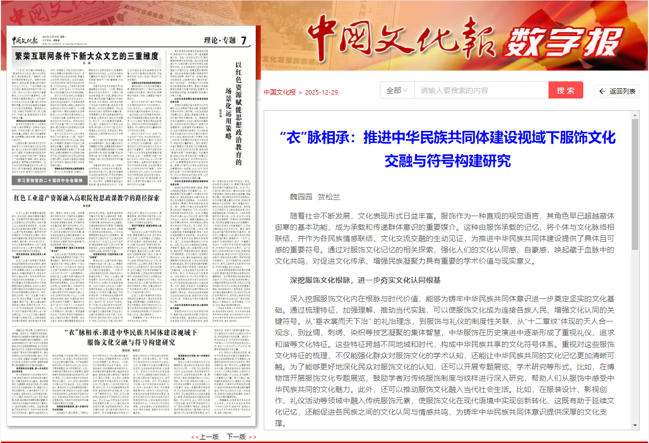 《中国文化报》(2025年12月29日 第7版 理论专题)刊登江西服装学院马克思主义学院教师魏园园、贺松兰署名的文章《“衣”脉相承:推进中华民族共同体建设视域下服饰文化交融与符号构建研究》。文章指出,随着社会不断发展,文化表现形式日益丰富。服饰作为一种直观的视觉语言,其角色早已超越蔽体御寒的基本功能,成为承载和传递群体意识的重要媒介。这种由服饰承载的记忆,将个体与文化脉络相联结,并作为各民族情感联结、文化交流交融的生动见证,为推进中华民族共同体建设提供了具体且可感的重要符号。通过对服饰文化记忆的相关探索,强化人们的文化认同感、自豪感,唤起藏于血脉中的文化共鸣,对促进文化传承、增强民族凝聚力具有重要的学术价值与现实意义。
