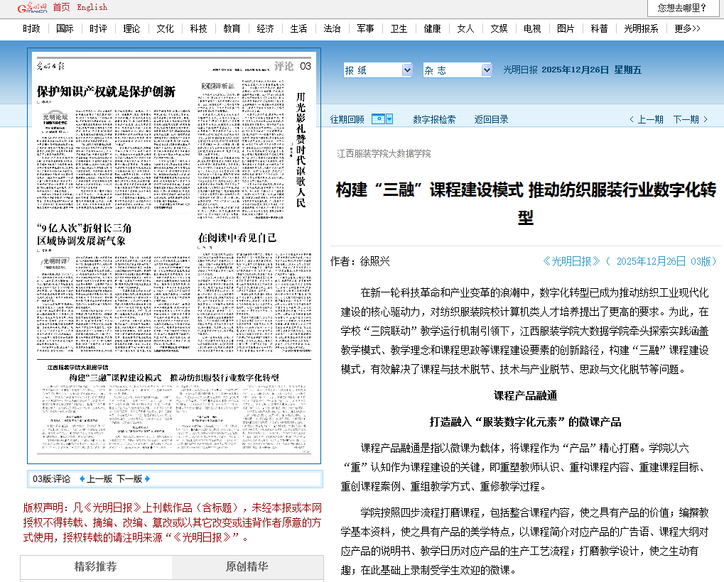 《光明日报》(2025年12月26日 第3版)刊登江西服装学院大数据学院徐照兴署名的文章《构建“三融”课程建设模式 推动纺织服装行业数字化转型》。文章指出,在新一轮科技革命和产业变革的浪潮中,数字化转型已成为推动纺织工业现代化建设的核心驱动力,对纺织服装院校计算机类人才培养提出了更高的要求。为此,在学校“三院联动”教学运行机制引领下,江西服装学院大数据学院牵头探索实践涵盖教学模式、教学理念和课程思政等课程建设要素的创新路径,构建“三融”课程建设模式,有效解决了课程与技术脱节、技术与产业脱节、思政与文化脱节等问题。