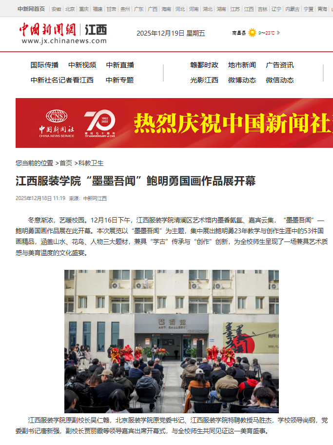 冬意渐浓,艺暖校园。12月16日下午,江西服装学院清澜区艺术馆内墨香氤氲、嘉宾云集,“墨墨吾闻”—鲍明勇国画作品展在此开幕。本次展览以“墨墨吾闻”为主题,集中展出鲍明勇23年教学与创作生涯中的53件国画精品,涵盖山水、花鸟、人物三大题材,兼具“学古”传承与“创作”创新,为全校师生呈现了一场兼具艺术质感与美育温度的文化盛宴。