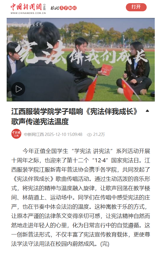 今年正值全国学生“学宪法 讲宪法”系列活动开展十周年之际,也迎来了第十二个“12·4”国家宪法日。江西服装学院江服新青年普法协会携手各学院,共同发起了《宪法伴我成长》歌曲传唱活动。通过生动活泼的音乐形式,将宪法的精神与温度融入旋律,让歌声回荡在教学楼间、林荫道上、运动场中。同学们在传唱中感受宪法的庄严,也在节奏中体会法治的温度。这种寓教于乐的方式,让原本严谨的法律条文变得亲切可感,让宪法精神自然而然地走进年轻人的心里,化为日常言行中的自觉遵循。这一创新普法形式,不仅丰富了宪法宣传教育载体,更使尊法学法守法用法在校园内蔚然成风。