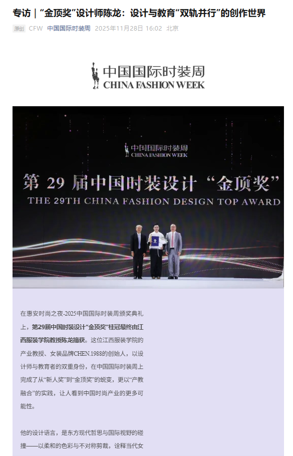 在惠安时尚之夜-2025中国国际时装周颁奖典礼上,第29届中国时装设计“金顶奖”桂冠最终由江西服装学院教授陈龙摘获。这位江西服装学院的产业教授、女装品牌CHEN.1988的创始人,以设计师与教育者的双重身份,在中国国际时装周上完成了从“新人奖”到“金顶奖”的蜕变,更以“产教融合”的实践,让人看到中国时尚产业的更多可能性。