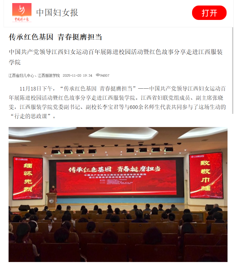 11月18日,“传承红色基因 青春挺膺担当”——中国共产党领导江西妇女运动百年展陈进校园活动暨红色故事分享会在江西服装学院举行。江西省妇联党组成员、副主席张晓雯,江西服装学院党委副书记、副校长李宝君等校领导、嘉宾与师生代表齐聚思贤楼报告厅,共同参与了这场沉浸式的“行走的思政课”。本次活动由江西省妇女联合会与江西服装学院妇女联合会联合主办,旨在回溯江西妇女运动的百年光辉历程,通过讲述感人至深的红色故事,激励青年一代尤其是女大学生从历史中汲取奋进力量,在新时代新征程上勇担使命、建功立业。