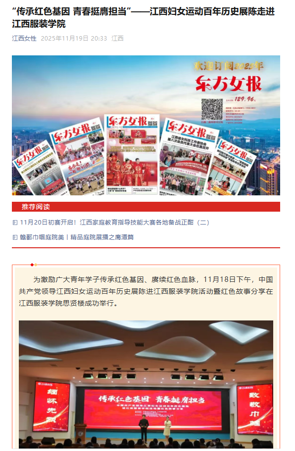 为激励广大青年学子传承红色基因、赓续红色血脉,11月18日下午,中国共产党领导江西妇女运动百年历史展陈进江西服装学院活动暨红色故事分享在江西服装学院思贤楼成功举行。本次活动由江西省妇联、江西服装学院联合主办,省妇女儿童中心承办。省妇联党组成员、副主席张晓雯,省妇联原二级巡视员李景芝,江西服装学院党委副书记、副校长李宝君出席,省委党史研究室宣教处、省妇联机关党委(人事部)、省妇儿中心有关同志以及江西服装学院师生代表约600人参加活动。