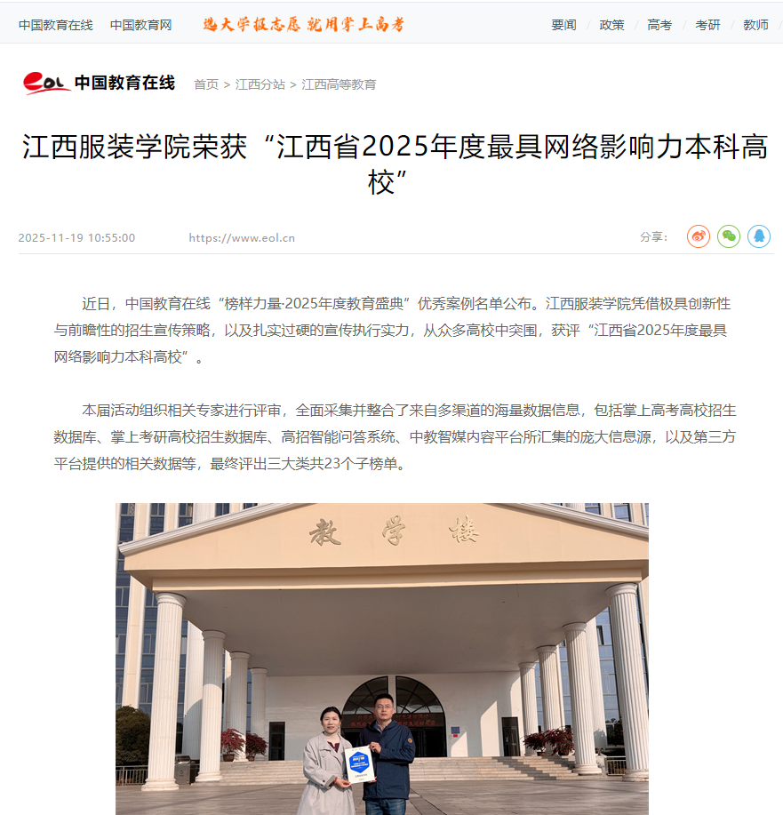 原文链接:中国教育在线:江西服装学院荣获“江西省2025年度最具网络影响力本科高校”