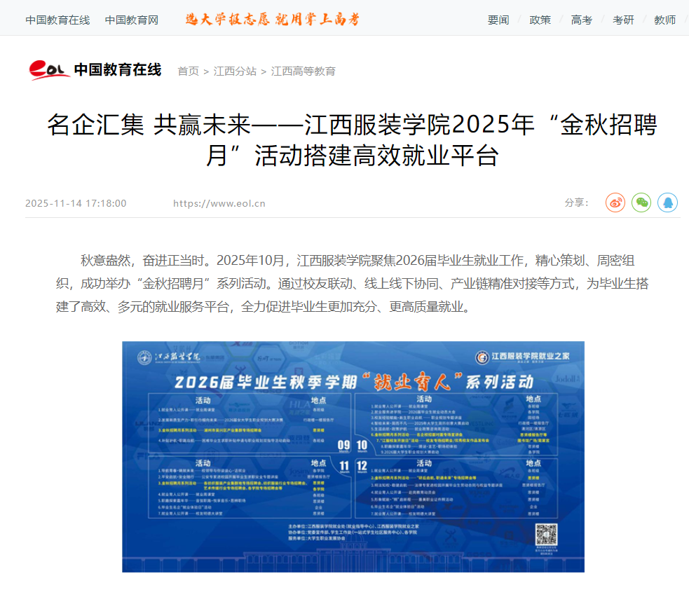 秋意盎然,奋进正当时。2025年10月,江西服装学院聚焦2026届毕业生就业工作,精心策划、周密组织,成功举办“金秋招聘月”系列活动。通过校友联动、线上线下协同、产业链精准对接等方式,为毕业生搭建了高效、多元的就业服务平台,全力促进毕业生更加充分、更高质量就业。