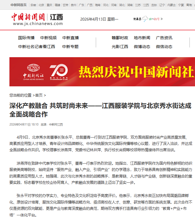 4月9日,北京秀水街董事长张永平、总裁董青一行到访江西服装学院,双方围绕服装时尚产业高质量发展、高素质应用型人才培养、青年设计师品牌孵化、中华传统服饰文化国际传播等核心议题,进行了深入洽谈,并达成全面战略合作共识。学校理事长涂燕萍、党委书记林井萍、执行校长尚钢等校领导热情接待并出席洽谈。