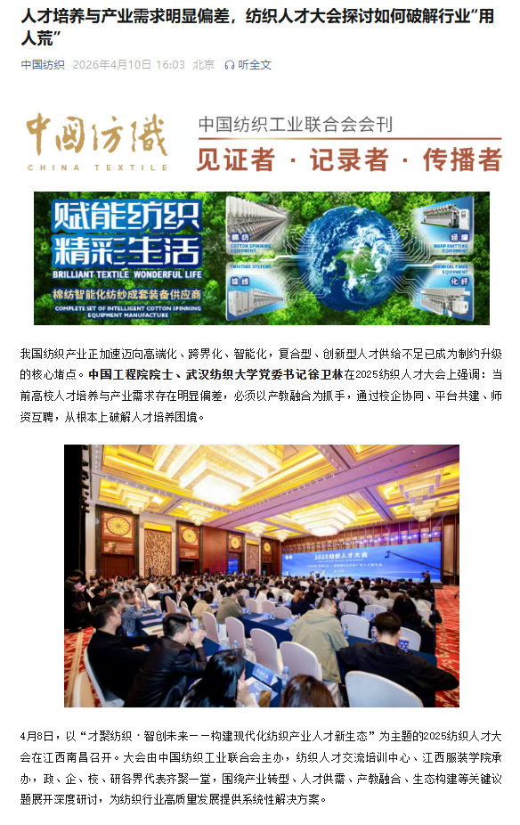 4月8日,以“才聚纺织・智创未来——构建现代化纺织产业人才新生态”为主题的2025纺织人才大会在江西南昌召开。大会由中国纺织工业联合会主办,纺织人才交流培训中心、江西服装学院承办,政、企、校、研各界代表齐聚一堂,围绕产业转型、人才供需、产教融合、生态构建等关键议题展开深度研讨,为纺织行业高质量发展提供系统性解决方案。