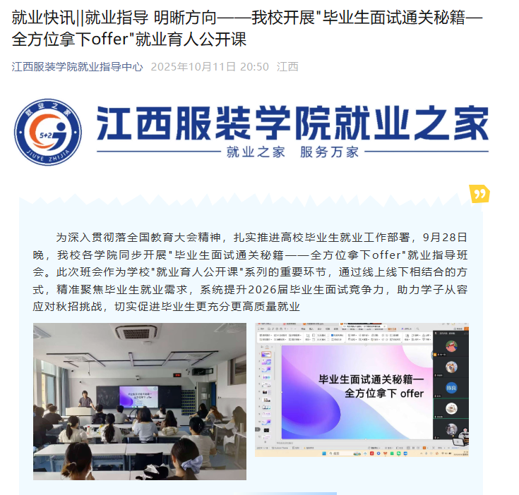 在拓展岗位的同时,学校持续强化就业指导服务。早在7月份就面向2026届毕业生开展就业技能系列培训。秋季学期以来,就业处系统推出“就业育人公开课”主题班会,围绕简历撰写、面试礼仪、职业规划等内容开展精准指导,助力毕业生提升就业综合竞争力,赢得职场主动。