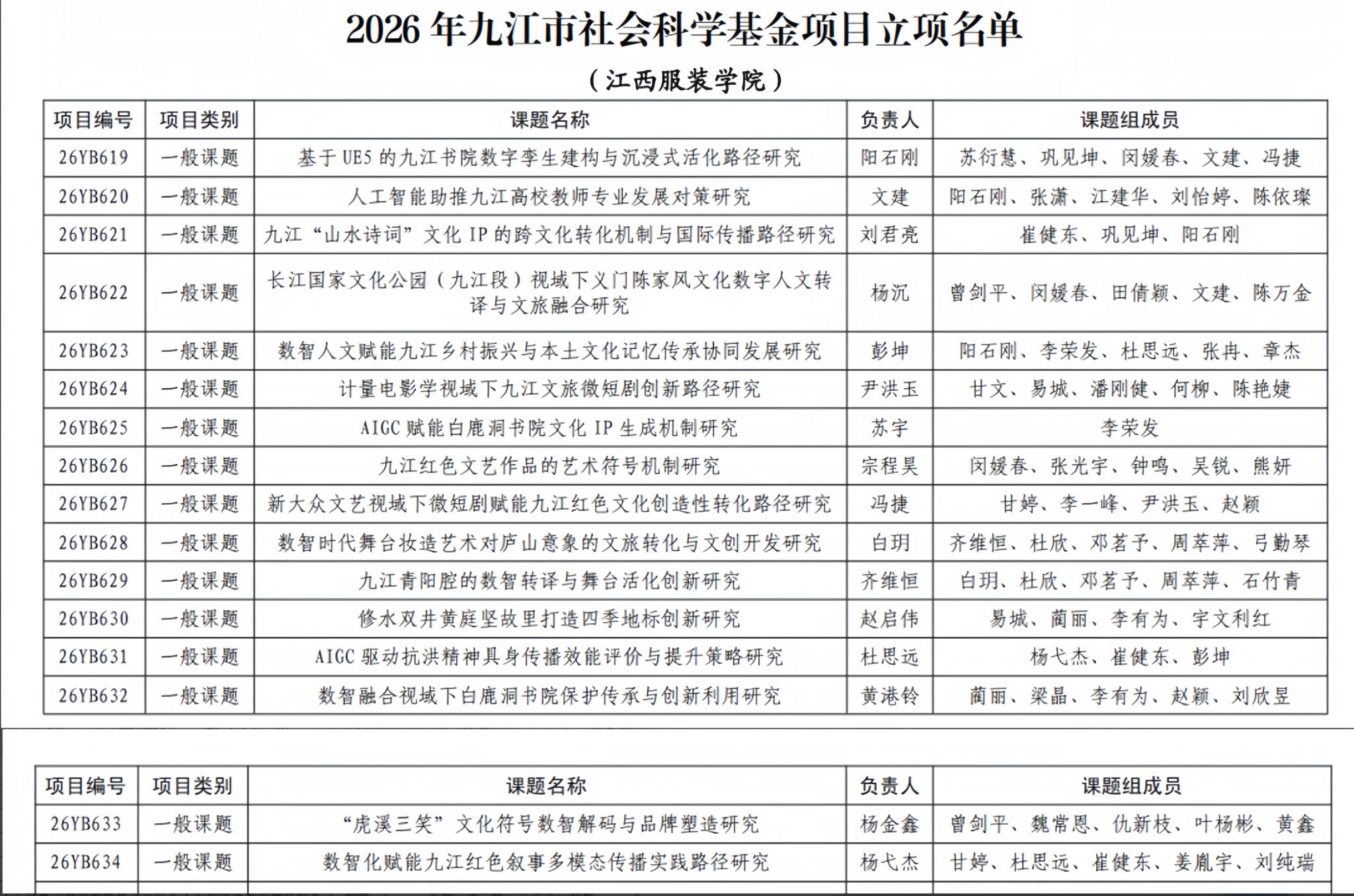 新闻中心讯(供稿/ 科技产业处)近日,九江市社会科学界联合会正式发布《关于2026年九江市社会科学基金项目立项名单的通知》,江西服装学院16项课题成功获批立项,立项数量与研究质量再创佳绩,充分彰显学校在人文社科、数字文创、文旅融合等领域的强劲科研实力与显著育人成果。
