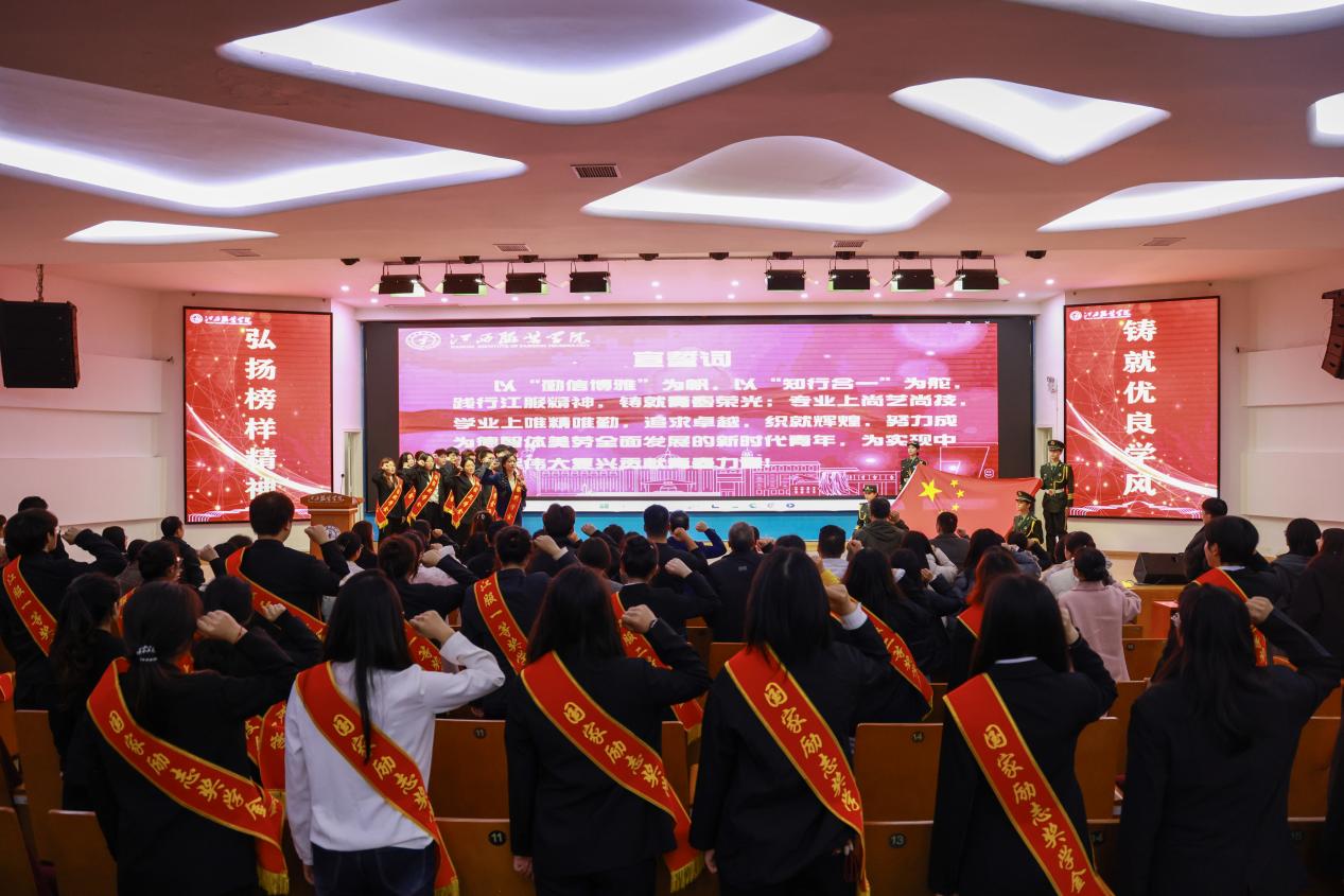 “以‘勤信博雅’为帆,以‘知行合一’为舵,践行江服精神,铸就青春荣光;专业上尚艺尚技,学业上唯精唯勤,追求卓越,织就辉煌,努力成为德智体美劳全面发展的新时代青年,为实现中华民族伟大复兴贡献青春力量!”在国家奖学金获奖代表的领誓下,全体学生庄严宣誓,铿锵誓言彰显了江服学子奋发向上的坚定决心。大会在全场齐唱校歌《书写华章 织就辉煌》的激昂旋律中圆满落幕。