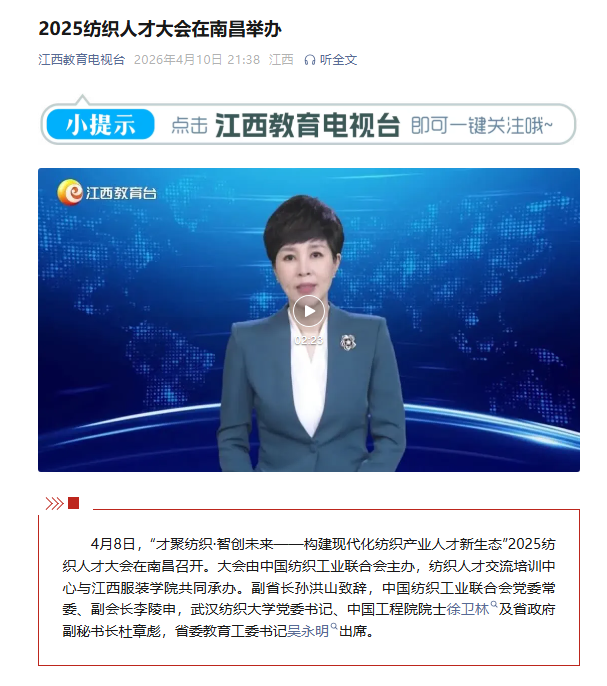 4月8日,“才聚纺织·智创未来——构建现代化纺织产业人才新生态”2025纺织人才大会在南昌召开。大会由中国纺织工业联合会主办,纺织人才交流培训中心与江西服装学院共同承办。副省长孙洪山致辞,中国纺织工业联合会党委常委、副会长李陵申,武汉纺织大学党委书记、中国工程院院士徐卫林及省政府副秘书长杜章彪,省委教育工委书记吴永明出席。