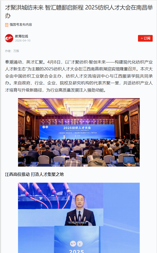 春潮涌动,英才汇聚。4月8日,以“才聚纺织·智创未来——构建现代化纺织产业人才新生态”为主题的2025纺织人才大会在江西南昌前湖迎宾馆隆重召开。本次大会由中国纺织工业联合会主办,纺织人才交流培训中心与江西服装学院共同承办。来自政府、行业、企业、院校及研究机构的代表齐聚一堂,共话纺织产业人才培育与升级新路径,为行业高质量发展注入强劲动能。