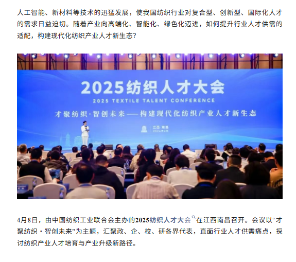 春潮涌动,英才汇聚。4月8日,以“才聚纺织·智创未来——构建现代化纺织产业人才新生态”为主题的2025纺织人才大会在江西南昌前湖迎宾馆隆重召开。本次大会由中国纺织工业联合会主办,纺织人才交流培训中心与江西服装学院共同承办。来自政府、行业、企业、院校及研究机构的代表齐聚一堂,共话纺织产业人才培育与升级新路径,为行业高质量发展注入强劲动能。