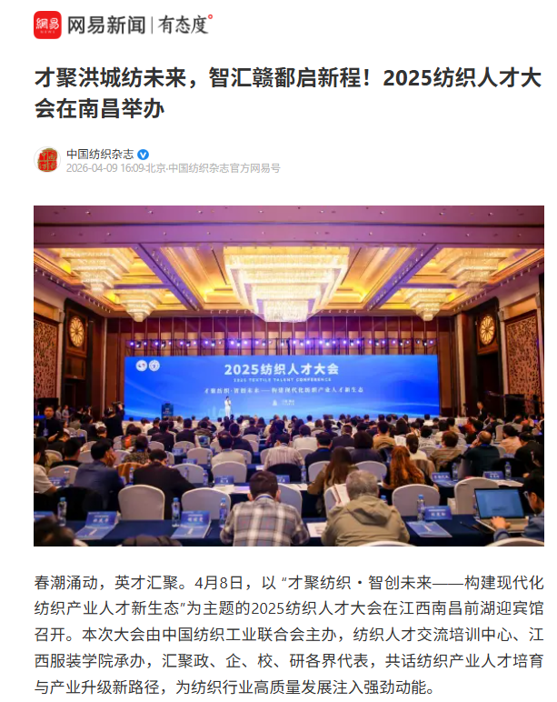 春潮涌动,英才汇聚。4月8日,以 “才聚纺织・智创未来——构建现代化纺织产业人才新生态”为主题的2025纺织人才大会在江西南昌前湖迎宾馆召开。本次大会由中国纺织工业联合会主办,纺织人才交流培训中心、江西服装学院承办,汇聚政、企、校、研各界代表,共话纺织产业人才培育与产业升级新路径,为纺织行业高质量发展注入强劲动能。